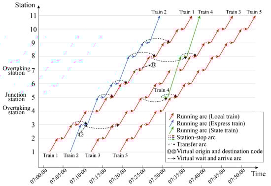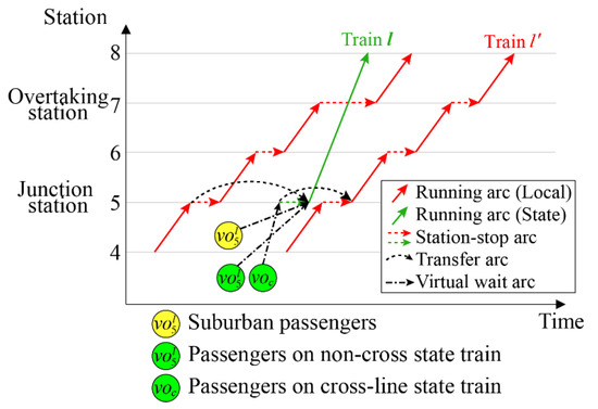 Additionally, the situation at the junction station is different from other stations. There are three types of waiting passengers: the passengers of the suburban line itself, the state passengers on the cross-line train, and state passengers on the non-cross train, as shown in Figure 5. Passengers on the non-cross state train need to transfer from the state railway hub station platform to the suburban railway platform at the junction station, and an extra time cost should be considered in the travel time of the waiting arc. For passengers on the cross-line train, the waiting time of the waiting arc is 0.