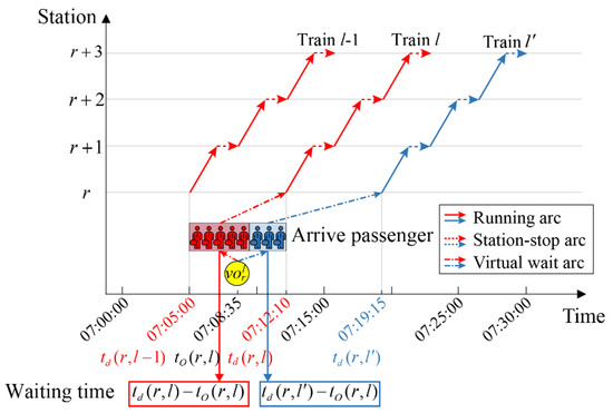 Passengers will make a choice when there are different kinds of trains operating on the line. When the train they want to take is not the current arrival train, the waiting time will be extended. Let denote the waiting arc from virtual origin node to the departure node . This represents passenger waits for train whereas the current arrival train is l at origin station r. Assuming that the passengers arrive at the station following the uniform distribution, the corresponding passenger average arrival time is the intermediate value of the departure time and , as shown in Figure 4. The waiting time of the waiting arc can be calculated by Equation (1). If the current train is l and passenger also choose to take train l, then ,