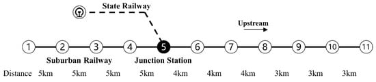 “Y” type is a standard network structure type of cross-line operation. The state railway connects to the suburban railway line at the junction station, as shown in Figure 1. The terminal station of the state railway line is the intermediate station of the suburban line, and the state trains can run across onto the suburban line through the junction station. In other words, the state railway trains and suburban railway trains share the same track in the central urban area. The cross-line operation can be an excellent way to reduce the transfer time in a transportation junction hub and meet the demands of passengers who take the state train and desire to arrive at the stations in the urban center quickly and directly.