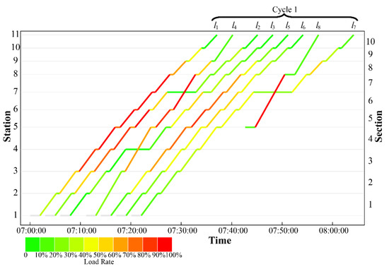 This example takes the cyclical operation plan. In each operation cycle, there are eight trains operating on the line. The order of departure is as follows: three local trains, one express train, three local trains, and one state train. Based on the basic information, which includes train departure interval, station stop time, the section running time, and overtaking conditions, the train timetable is calculated and shown in Figure 8.