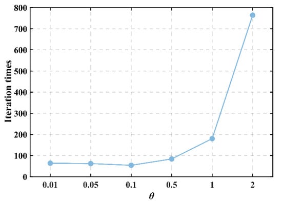 The parameter θ represents the degree of familiarity of passengers with network operation information, and it has a significant impact on the result of passenger assignment. The least iteration time required by the proposed algorithm under different θ values is shown in Figure 11. The larger the value of θ, the more passengers are familiar with the operation status, and the greater probability of choosing the path with the lowest travel cost. The passenger assignment results are also more in conformity with reality. However, the solution approach will take longer to reach a stable state.