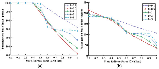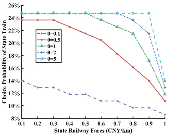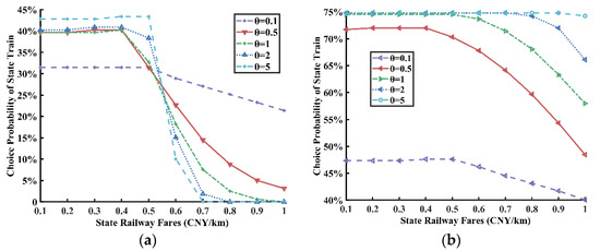 Separately, in Figure 13a, when the fare is less than 0.5 CNY/km, the greater the θ, the higher the probability of choosing the state train and vice versa. Therefore, it can be concluded that when the state railway fare is below 0.5 CNY/km, passengers are willing to wait for the next state train even with a longer waiting time. When the fare is greater than 0.5 CNY/km, the disadvantage of the additional waiting time will not be compensated. At this moment, the higher the θ value, the more sensitive passengers are to fares and the lower the probability of choosing the state train. In Figure 13b, the larger the θ value is, the greater the choice probability is, regardless of the fare. These passengers do not need additional waiting time, and the state train has a very high attraction.