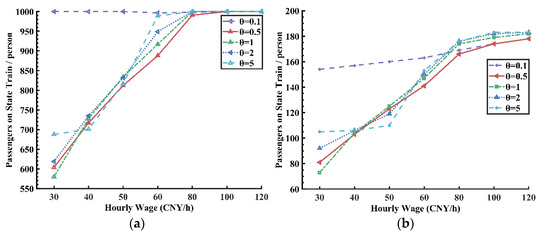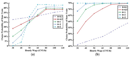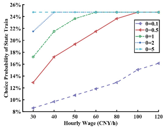 As also can be seen in Figure 16b and Figure 17, when the current arriving train is the state train, there is no extra waiting time, regardless of the hourly wage, and the time cost saved by state train is higher than the fare cost increment. The choice probability of state train gradually increases with the higher hourly wage, and the larger θ is, the greater the choice probability is.
