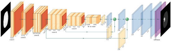 The original FCN architecture [40] is the fully connected version of the VGG-16 network. The encoder-decoder network leaves the encoder part the same as it is in VGG-16, and the fully connected layers of VGG are replaced by fully convolutional layers to form the deconvolutional part of the architecture (Figure 1). The classification layer is substituted by a bottleneck layer of kernel. Down-sampling is carried out by pooling layers and up-sampling is performed by deconvolution layers. In total, there are 5 stages of halving and a corresponding 5 stages of doubling the previous feature maps from the input size of and downwards (encoding part) and vice versa in the decoding part until the original size is reached. There are 2 convolutional layers in the full size followed by 2 convolutional layers in the half-size and 3 convolutional layers in the , , and sizes. The up-sampling upconvolutional layers follow the same pattern. The convolutional kernels are in each layer with corresponding stride and padding to maintain the same output size for each conv-layer.