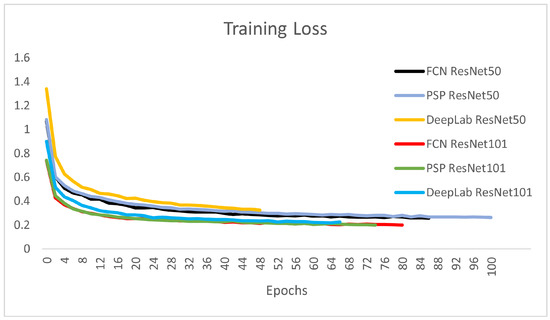 It can be observed that the DeepLab-ResNet50 was stopped at epoch 49 because it had the highest training loss and lowest validation accuracy from all the six architectures.The best architecture from the perspective of overall accuracy are the DeepLab-ResNet101, PSP-ResNet101, FCN-ResNet101, and FCN-ResNet50. The stopping condition of the final epoch was set by considering the stopping patience of four epochs with non-decreasing training loss, and the stopping tolerance was set to 0.001. This was the reason for different stopping epochs of the networks (Table 1).