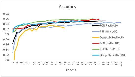 Figure 9 and Table 1 show the overall validation accuracy for the networks presented. From the perspective of the validation accuracy for all classes, the PSP-ResNet101 is the best, followed by FCN-ResNet101 and DeepLab-ResNet101. The overall validation accuracy is measured on the validation set and is obtained as the mean accuracy (Equation (2)) over all four classes.