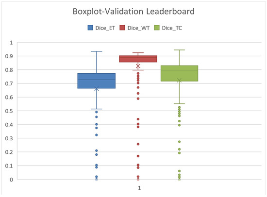 In Table 2, we measured the Dice scores for background voxels, healthy voxels, and the Whole Tumor (classes 2/4 + 3 + 5). The detection of background and healthy voxels is as expected. Background Dice is between 99.29 and 99.7%, and for healthy voxels, the Dice is between 95.99 and 97.46%. The detection of tumor voxels is about 90% (88.89–90.66%), which is a good result compared to the BraTS Challenge WT (Whole Tumor) average of 82.74%. The average WT Dice score of the BraTS Challenge is based on the validation table results, namely, the Validation Leaderboard [14]. The best result on the leaderboard had a Dice coefficient of 92.45%, and 80 participants out of a total of 291 are above 90%.