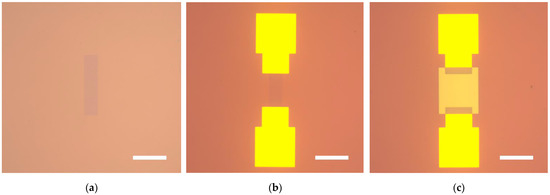 The optical images were taken using an optical microscope (ZEISS (Oberkochen, Germany), Axio Imager A2m). The Raman spectra were collected with a micro-zone confocal Raman system (WITec alpha 300R) under 532 nm laser illumination. The thickness of the MoTe2 film was measured using an atomic force microscope (Asylum Research (Abingdon, UK), Cypher S). All the electrical measurement was conducted in a probe station that was connected to a semiconductor characterization system (Keithley 4200-SCS). For the NIR photoresponse measurement, the 1064 nm laser was introduced to the probe station through a multimode optical fiber with normal incidence. The laser beam is 2.4 mm in diameter. A mechanical chopper, a fixed resistor (5 kΩ), and a digital phosphor oscilloscope (Tektronix DPO 2024) were employed to characterize the temporal photoresponse performance. All the characterizations were performed at room temperature in ambient conditions.