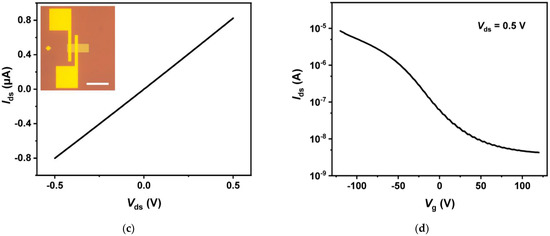 We first characterized the electrical properties of the graphene and MoTe2 films by fabricating graphene and MoTe2 field-effect transistors (FETs), as shown in the insets of Figure 3a,b, respectively. The FETs were fabricated on 285 nm SiO2/p+-Si substrates with Pd/Au (10/50 nm) source and drain electrodes made on two ends of the channel. The p+-Si was used as the back gate. Figure 3a,b show the source–drain current–voltage (Ids–Vds) curve and transfer curve of the graphene FET, respectively. The Ids–Vds curve shows linear behavior, indicating the ohmic contact between the graphene and the Pd/Au electrodes. The transfer curve exhibits p-type behavior. Figure 3c,d show the Ids–Vds curve and transfer curve of the MoTe2 FET, respectively. The transfer curve also exhibits p-type behavior with good ohmic contact between the MoTe2 and the Pd/Au electrodes.