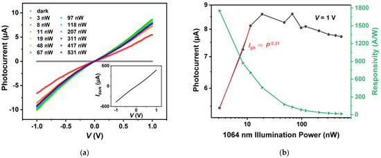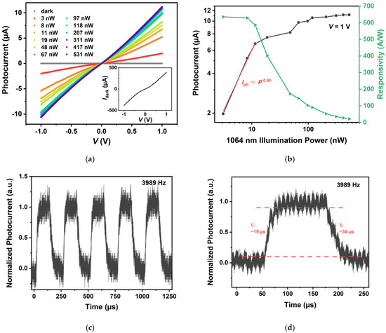 Figure 5a shows the photocurrent (Iph)–voltage (V) curves of a representative heterostructure device (device 1) under 1064 nm laser illumination with different illumination power (P) from 3 nW to 531 nW. The inset in Figure 5a shows the current (I)–V curve of device 1 under dark conditions. Here, the photocurrent is defined as Iph = Ilight − Idark, where Ilight and Idark refer to the currents under light illumination and dark conditions, respectively. The illumination power is calculated by multiplying the power density by the device’s effective area, i.e., the overlapping area (S, 1600 μm2) of the bottom and top graphene electrodes. It is shown that Iph increases linearly with V regardless of illumination power. In addition, for identical bias, Iph increases monotonically with illumination power. The Iph and illumination power relation measured at V = 1 V is shown in Figure 5b (the black line). We can see that Iph increases almost linearly in the lower power range but shows a saturated trend when illumination power is higher. Similar phenomena have also been reported before [1,3,4,8,16]. The possible reasons are the increased recombination rate of photogenerated carriers [16], the reduced number of photogenerated carriers contributing to photoconduction under higher photon flux [16], and the existence of trap states in the device [4,16]. As shown by the fitted curve in Figure 5b, the photocurrent and illumination power present a sublinear relation, which can be expressed as Iph = aPb, where a and b are fitted constants. According to the fitting results, we acquired b = 0.91 ± 0.07 (R2 = 0.997) in lower power range. The b value that is smaller than 1 suggests that the photoconduction gain is influenced by the charge traps in the materials and/or their interfaces [2,4,16,17,18,19]. The device’s responsivity (R) and illumination power relation measured at V = 1 V is shown in Figure 5b (the green line). The responsivity is defined as R = Iph/P [4,20]. As illumination power increases, the responsivity decreases monotonically, which corresponds to the saturated trend of the photocurrent. A maximum responsivity of up to 635 A/W is acquired with 3 nW illumination power. Specific detectivity (D*) is another important parameter for a photodetector, which is used to evaluate the capability of weak light detection. When the shot noise from the dark current is the major source of the total noise, specific detectivity can be expressed as D* = RS1/2/(2eIdark)1/2 [4,20,21], where e is the electron charge. Assuming the shot noise from the dark current is the major noise in our case, the specific detectivity of device 1 was calculated to be 2.26 × 109 Jones (cm Hz1/2 W−1) at V = 1 V and 3 nW illumination power. However, it is worth mentioning that, besides shot noise, flicker noise may be of some importance in MoTe2-based devices [22]. Apart from responsivity and specific detectivity, response time is also an important parameter for a photodetector. Figure 5c shows the normalized photocurrent waveform under chopped 1064 nm laser illumination. With a chopping frequency of 3989 Hz, the device presented a stable and repeatable photocurrent response. The rise (fall) time tr (tf) is defined as the time needed for photocurrent to rise (fall) from 10% (90%) to 90% (10%) of the maximum photocurrent in a single response cycle [16,23,24,25]. A rise (fall) time of 19 μs (34 μs) can be acquired from Figure 5d. It is worth noting that, considering the intrinsic response time of the mechanical chopping process (~10 μs) [8], the real response and recovery time of the device should be even shorter.