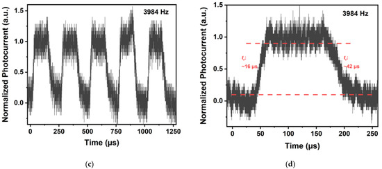 In an attempt to improve the device performance, we deposited a 20 nm thick Al2O3 layer on the as-fabricated devices via the ALD method to protect the devices from ambient. Figure 6a,b show the responsivity-related curves of an encapsulated device (device 2). Similarly, Iph shows a saturated trend when illumination power gets higher (the black line in Figure 6b). Moreover, as illumination power increases, the responsivity decreases monotonically (the green line in Figure 6b). Notably, we obtained an ultrahigh responsivity of up to 1752 A/W at 3 nW illumination power. Meanwhile, assuming the shot noise from the dark current is the major noise, the specific detectivity of device 2 was calculated to be 5.68 × 109 Jones (cm Hz1/2 W−1) at V = 1 V and 3 nW illumination power. The higher responsivity of device 2 in the lower power range may owe to a passivation effect on the surface state-related recombination centers brought by the Al2O3 layer [20,26,27,28], which consequently reduced the recombination of photogenerated carriers and results in enhanced responsivity. According to the fitting results for Iph and illumination power relation, we obtained b = 0.31 ± 0.02 (R2 = 0.998) in the lower power range. The smaller b value indicates that the trap states play a larger role in the photoconduction gain [29]. Figure 6c,d show the temporal photoresponse performance of the device. The device presented a stable and repeatable photocurrent response under light illumination, with a chopping frequency of 3984 Hz and underestimated rise (fall) time of 16 μs (42 μs).