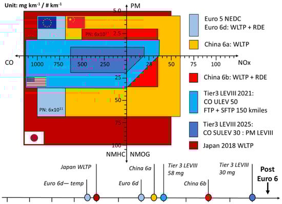 Figure 1. Simplified diagram of emission limits and phase-in timing in four of the main world regions (LEV: low—emission vehicle, ULEV: ultra-low-emission vehicle, WLTP: World LDV Test Procedure, FTP: Federal Test Procedure, SFTP: supplemental FTP, and RDE: real driving emissions).