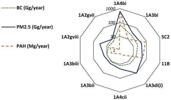 Figure 2. EU28 official emissions in kt year−1 or t year−1 (Gg or Mg year−1) for BC, PM2.5 and PAHs (as the sum of benzo(a)pyrene, benzo(b)fluoranthene, benzo(k)fluoranthene and indeno(1,2,3-cd)pyrene) in 2018 for the main emitting NFR sectors (refer to Table 3). Emissions are computed from the EMEP database [53].