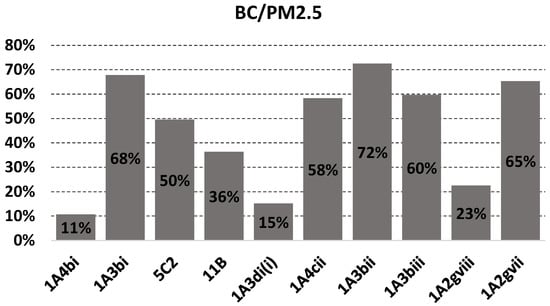 Figure 3. Ratio BC/PM2.5 for EU28 official emissions in 2018 computed from the EMEP database [53] for the main emitting NFR sectors (refer to Table 3).