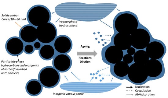 In general, internal combustion engine exhaust particles contain organic and elemental carbon (EC), metals and other elements [75,76]. In a recent study in China, Xiang et al. [77] demonstrated that BC from sources other than traffic have more and more importance even in urban areas. Carbon is the main element in particles emitted by diesel engines [78], as depicted in Figure 4. As the emission exhaust cools in the exhaust manifold and associated pipework, carbon particles agglomerate, forming high-surface-area material onto which uncombusted and partially combusted gaseous products are adsorbed, as well as sulphur oxides and nitrogen oxides (NOx) formed during high-temperature combustion in the cylinder. During the dilution of the exhaust aerosol to ambient conditions, a series of processes such as nucleation, coagulation ad- and absorption make particles, consisting of amorphous EC particle cores [79,80], more and more spherical with ageing (Figure 5), therefore lowering their fractal dimension [81,82,83,84]. Particulate OC also forms in the atmosphere through complex chemical pathways from primarily emitted gaseous organic compounds. This so called SOA species formation in urban areas was recently reviewed [85]. In U.S. cities, 20 to 60% of emissions, reactivity, and SOA-forming potential of anthropogenic VOCs are associated with mobile emission sources, demonstrating the impact of traffic on urban U.S. air quality [86,87]. The role of liquid phases in the particles has been demonstrated [88], using thermodynamic and kinetic modelling, so that the presence of three liquid phases in particles impacts their equilibration timescale with the surrounding gas phase. Three phases will likely also impact their ability to act as nuclei for liquid cloud droplets, the reactivity of these particles, and the mechanism of SOA formation and growth in the atmosphere.