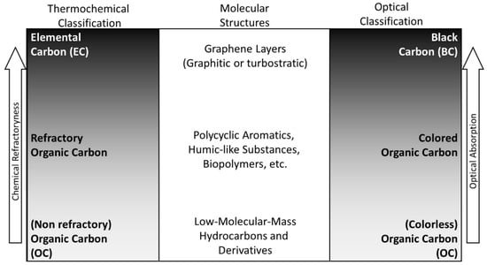 Figure 6. Optical and thermochemical classification of atmospheric carbonaceous particulate matter. BrC is an ensemble of light-absorbing (coloured) organic and relatively refractory macromolecules with a variety of molecular structures (diagram adapted from [72,105]).