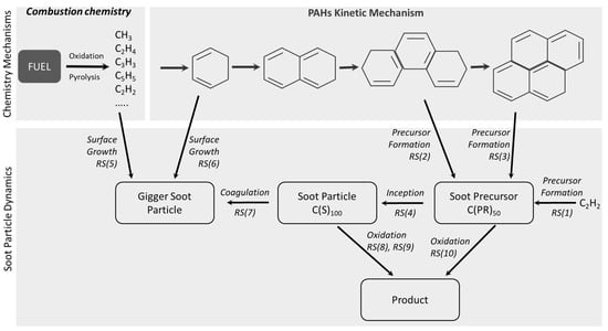 Figure 7. Soot formation pathways from fuel combustion adapted from several sources in the literature [127,128,129].