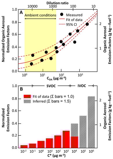 We often speak about semi-volatile organic compounds (SVOCs) to name the organic species that would exist in both the gas phase and the particulate phase. In atmospheric chemistry, there can be different definitions of SVOCs. One study proposed to measure SVOCs based on mass collected on a “bare-Q” Quartz filter including the primary particle and some fraction of the semi-volatile organic vapour [148]. This definition was taken up by further works [137,138,149,150] to study the gas/particle partitioning of primary OAs. Compounds with an effective saturation concentration C* below 10−3–10−4 µg m−3 are generally captured with such a method. Robinson et al. [151] define SVOCs as presenting in particulate form at a low dilution of emissions corresponding to the conditions under which PM2.5 emissions are measured in the US emission inventory. This definition has the disadvantage that the definition of SVOCs depends on the emission source, but the authors come to consider that compounds with a volatility less than or equal to 103 µg m−3 are SVOCs. Several other C*-based definitions of SVOCs exist in the literature, e.g., C* < 320 µg m−3 [113].