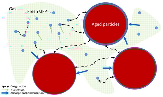 The evolution of the mixing state of particles, as depicted in Figure 5, is also important to better account the radiative effect of particles. Far from sources, particles are expected to be internally mixed and unfortunately most global models often work with the assumption of external mixing. This can lead to noticeable differences, as shown by [93,94,95,96].