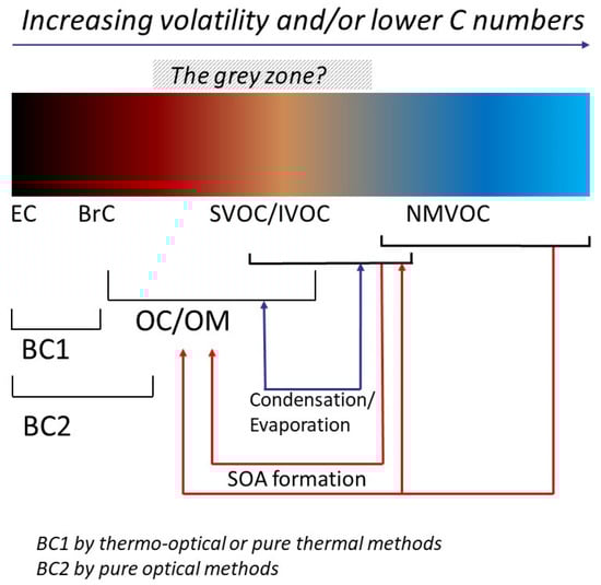 PM carbonaceous constituents can be classified according to their volatility and their light absorption spectra (Figure 6). These two properties are exploited by the main analytical methods implemented to address carbonaceous aerosols, namely thermal and optical methods. The class of carbonaceous PM which is not as refractory as EC and does not as ideally absorb all wavelengths (280 < λ < 2500 nm) as BC was named brown carbon (BrC) [103]. BrC consists of organic macromolecules with poorly characterised molecular structures, including fulvic acids, humic acids, and humic-like substances (HULIS) [104]. BrC constituents are characterised by their absorptivity, which increases more than proportionally with λ−1, i.e., they proportionally absorb more short wavelengths as compared to BC.