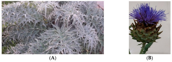 C. cardunculus L. (n° LISU266732) (Figure 1A) leaves and inflorescences were used. The adult leaves were harvested in March 2018, at Global Positioning System (GPS) coordinates 39°45′37.7″ N 8°27′49.3″ W, Portugal, and the inflorescences (Figure 1B) were harvested in July 2019 (end of flowering). The leaves (ripped roughly by hand) and inflorescence (stigmas) underwent a decoction process and each sample was weighed at a ratio of 10 g to 100 mL of household water and boiled for 20 min. After cooling, the preparation was filtered using Whatman® (Sigma, Germany) qualitative filter paper, Grade 1, and the filtrate was lyophilized.
