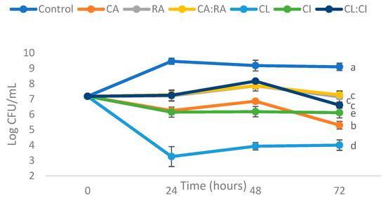 Figure 2 shows that all samples reduce the growth of P. putida ESACB 191 compared to the control at a 95% confidence level, within the first 24 h of incubation time. CL showed the greatest reduction in bacterial growth at 24 h, followed by CI and CA.