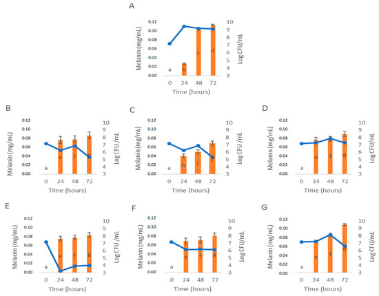 Influence of C. cardunculus extracts and phenolic acids in melanin bioproduction by P. putida ESACB 191. (A). Control; (B). Rosmarinic acid; (C). Chlorogenic acid; (D). 50% Chlorogenic acid + 50% Rosmarinic acid; (E). Leaf decoction extract; (F). Inflorescence decoction extract; (G). 50% Leaves decoction + 50% Inflorescence decoction. The concentration 1 mg/mL was used for all samples tested in Müller–Hinton Broth with 1% of L-tyrosine. Lines represent P. putida ESACB 191 growth curve (Log CFU/mL) and bars represent melanin bioproduction (mg/mL).