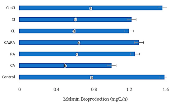 Therefore, the study of the influence of RA, CA, CA: RA, CL, CI, and CL: CI, on melanin bioproduction was tested for P. putida ESACB 191 strain (Figure 3).