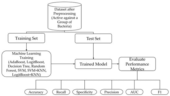 As illustrated in Figure 2, we applied several machine learning algorithms that are explained in the above section to classify antimicrobial and non-antimicrobial peptides. We also constructed stacking ensemble learners. All the findings we obtained in our study were obtained using 100-fold Monte Carlo Cross-Validation (MCCV) [85]. MCCV is a technique that selects a part of the data (unaltered) to create the training set, and then assigns the remaining data as the test set. This process is then repeated many times randomly, creating new training and testing segments each time. In our study, the training set is 90% of the data and the test is 10%.