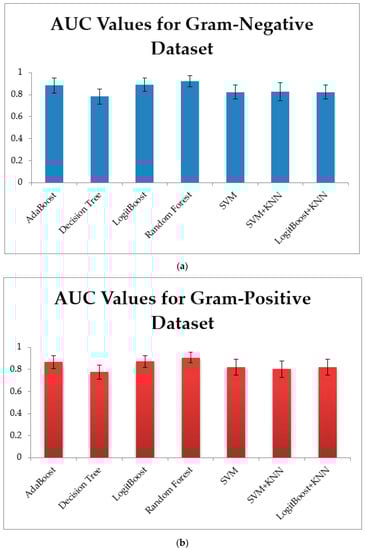 Comparison of the performances of different models in terms of their AUC values with standard deviation values for (a) Gram-negative, and (b) Gram-positive dataset, using physico-chemical features.