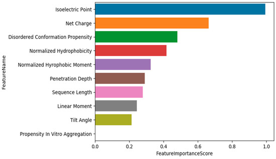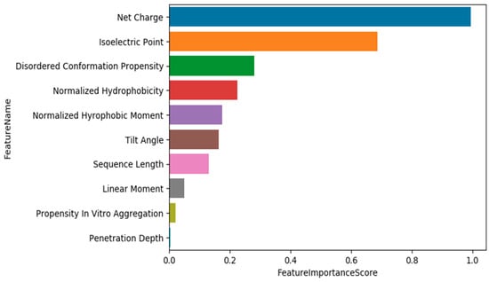 In this study, for each tested machine learning algorithm, we have recorded the scores assigned to each feature during the MCCV (100 iteration) procedure. Since we obtain higher performance metrics using RF classifier, we have utilized the feature scores of this model throughout the rest of the paper. When we analyze the feature scores (shown in Figure 4 and Figure 5), we observe that Net Charge, Isoelectric Point, Disordered Conformation Propensity, Normalized Hydrophobicity, and Normalized Hydrophobic Moment are more crucial features than others for both Gram-negative and Gram-positive datasets.