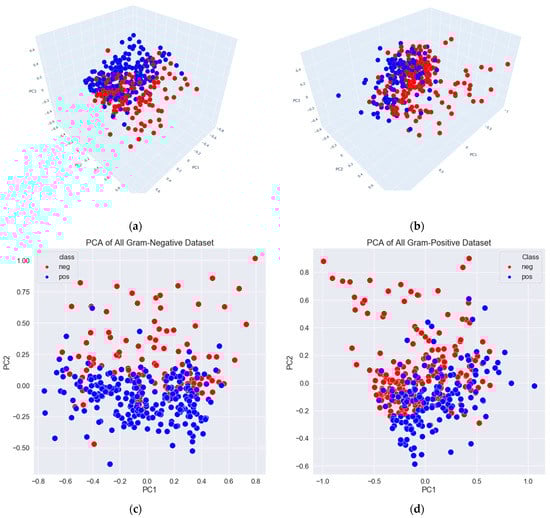 Principal component analysis results for Gram-negative dataset are shown in (a,c); for Gram-positive dataset are shown in (b,d). While 3D plots are presented in (a,b), 2D plots are presented in (c,d).