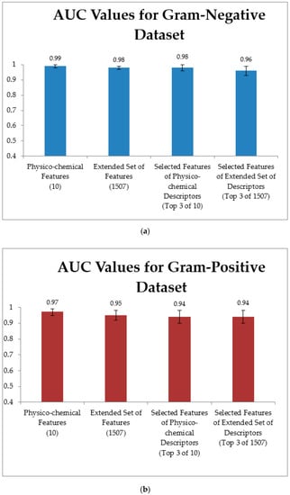 Similarly, to compare the performance metrics of the models which use physico-chemical features with the models which use the extended set of features, we reduced the number of features in the original dataset to the same number of features (top 3 scoring features). For this purpose, we applied the same feature selection strategy on our original dataset which includes only physico-chemical features. We wanted to test whether a certain number of attributes will be sufficient for prediction. In Figure 9, we present the AUC values obtained using (i) 10 physico-chemical features, (ii) extended set of features (1507 features), (iii) top 3 scoring features of physico-chemical descriptors, and (iv) top 3 scoring features of extended descriptors. As illustrated in Figure 9a, for the Gram-negative dataset, the models which use the physico-chemical features yield the best AUC score (99%). For this dataset, the extended features and the top 3 scoring features (normalized hydrophobicity, normalized hydrophobic moment, net charge) of the physico-chemical features generate the same AUC values (98%). It can be observed from Figure 9b that on the Gram-positive dataset, the model which uses physico-chemical features achieves 97% AUC and hence obtains better performance metrics than the extended dataset and than the models using top 3 scoring features. On the Gram-positive dataset, the top 3 scoring features of physico-chemical descriptors are net charge, isoelectric point, and disordered conformation propensity.
