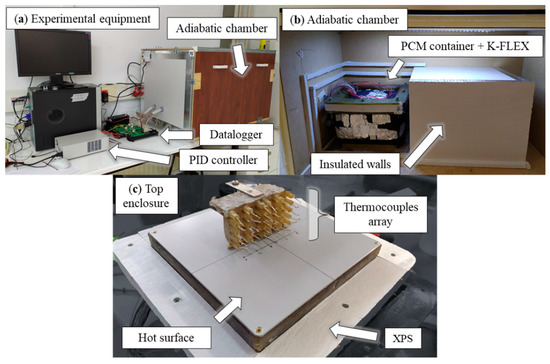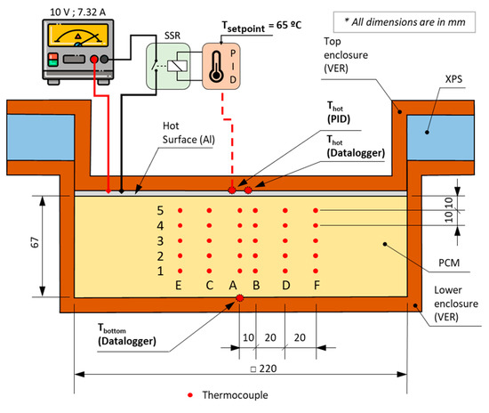 A square base volume with sides 220 mm × 220 mm and height 67 mm of PCM were tested, with thicknesses that are considered sufficient in solar panel applications [32]. The entire container was manufactured in vinyl ester resin (VER) with a thickness of 10 mm, making heat transmission through the walls negligible. An electrical resistance adhered to an aluminium plate laid on the top of the container was used as a heater, while a proportional-integral-derivative controller (PID) was used to regulate the temperature of the isothermal process (see Figure 1). The container was thermally insulated using extruded polystyrene (XPS) and K-FLEX ST of 19 mm [33] to minimize atmospheric heat loss. Additionally, all tests were performed in an adiabatic chamber (Figure 2).