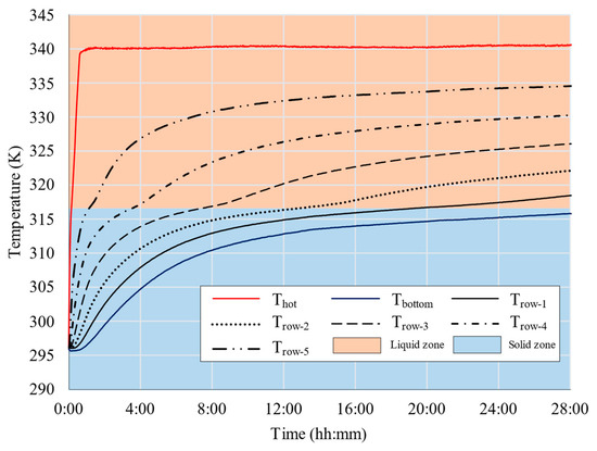 Evolution of the experimental PCM temperature (K) during the phase-change process.