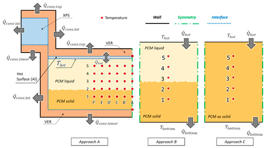 Three CFD simulation alternatives for the phase-change process in a thermal storage system using PCM, in which heat is applied from the overhead surface, were studied. The models ranged from a complete and realistic model (approach A) to a simple one based on a solid PCM system with variable properties (approach C). Figure 4 shows the diagrams corresponding to each approach. Geometries, main variables, and thermal fluxes presented in each model are shown.