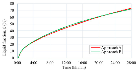 Evolution of the liquid fraction, β (%), estimation in approach A and B.