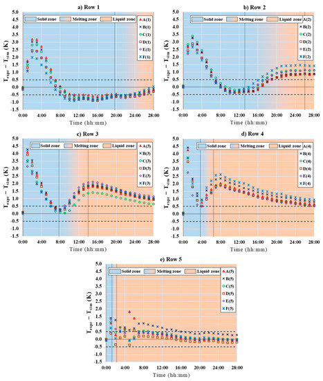 Temporal evolution of the differences between experimental and simulated temperatures, Texp − Tsim (K), obtained in approach A for each of the thermocouples in the experimental equipment, i(j), i = columns A to F; j = rows 1 to 5. Sub-figures (a–e) represented rows 1 to 5. Dashed lines show the experimental error of the thermocouple probes.