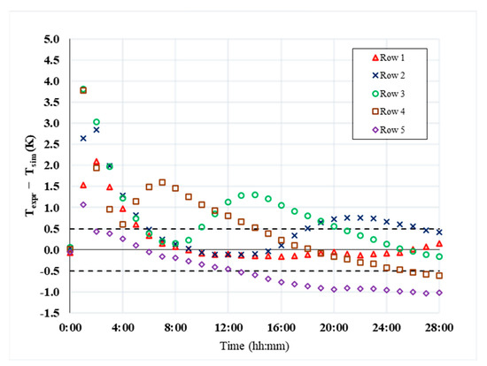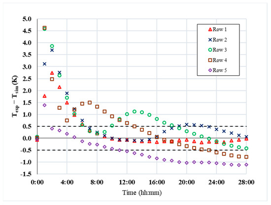 Temporal evolution of the differences between experimental and simulated temperatures, Texp − Tsim (K), obtained in approach C (EHC model) for each row of thermocouples in the experimental equipment. Dashed lines show the experimental error of the thermocouple probes.