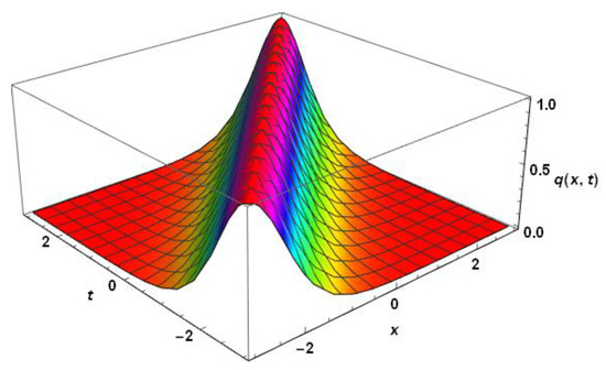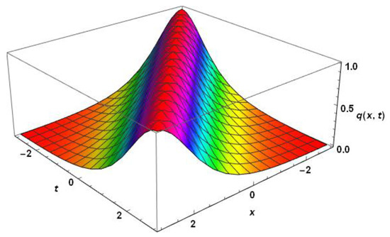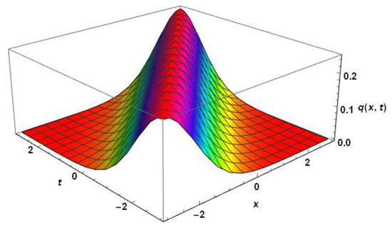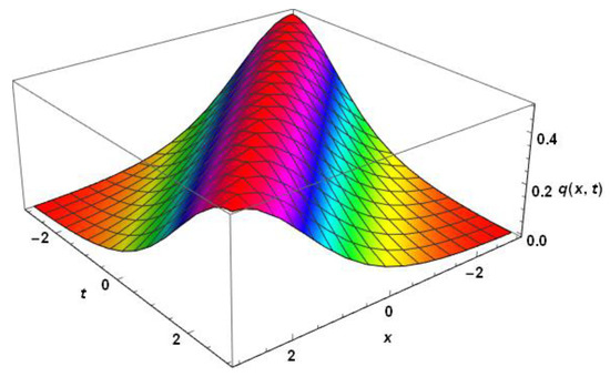for the solitary waves to exist. Figure 5 displays the surface plot of a solitary wave (65) for the power–law Gardner’s equation with triple dispersion terms with . The parameter values chosen are , , , , , and .