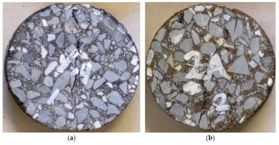 Images of test specimens after ITS test: (a) control mix—Mix 1, (b) Mix 2–5% capsules, (c) Mix 3–10% capsules and (d) Mix 4–20% capsules.