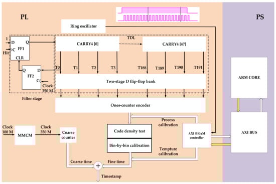 Block diagram of the proposed TDC. The programmable logic (in orange) and processing system (in purple).
