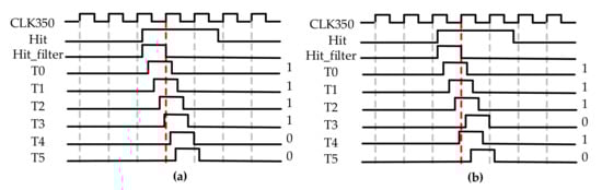The ones-counter encoder has been proposed as a remedy for bubble errors in the flash ADC [28]. The example illustrated in Figure 3 demonstrates the principle of the ones-counter encoder to solve this problem, with the state of each tap indicated as T0, T1, …, and T5. The TDL output is a perfect thermometer code when the tap sequence matches the actual delay sequence, as shown in Figure 3a. In Figure 3b, the TDL output has bubbles (if the tap sequence does not match the sequence). In fact, the output codes of the two situations have the same number of ones. The output “1” indicates the number of taps covered by the hit. It is not difficult to predict the ones-counter encoder will generate the same binary code no matter if there is a bubble error or not. It simplifies and clarifies the TDC design. Unlike the flash ADC design, this paper focuses on which encoder can best balance resources, power consumption, and operating speed to accomplish high speed measurement in a reasonable manner.