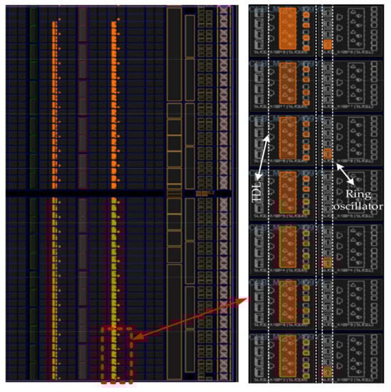 Layout view of the delay line and the ring oscillator in the proposed on-line calibration.