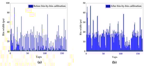 Online calibration is performed to track and compensate PVT variations. Due to process, the delay element is not as uniform as the dedicated delay line in the ASIC. Some delay elements may have a small delay, whereas some delay elements may have a large delay. If the delay of each delay element is consistent, the bin width of each tap is uniform. The bin width of each tap is obtained by a code density test [16,20,29,30]. To balance resources and a correction effect, 1,024,000 is chosen as the number of test N in this design. The bin width of each delay element is determined using the following equation: