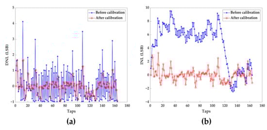 The DNL reached [−0.97, 4.12] LSB before calibration, and reached [−0.90, 1.67] LSB after bin-by-bin calibration (see Figure 9a). The INL reached [−2.45, 9.54] LSB before calibration, and reached [−1.90, 3.31] LSB after bin-by-bin calibration (see Figure 9b).