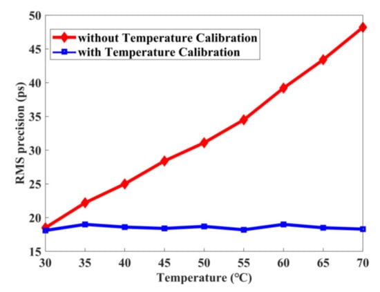 Figure 12 shows the change of frequency count with temperature. It can be seen that the frequency count value decreases linearly with the increase of temperature, about 4 °C. In order to estimate the change of RMS precision with temperature, the TDC online temperature compensation circuit is tested from 30 °C to 70 °C, as shown in Figure 13. Figure 13 shows that the TDC RMS precision without calibration increases linearly with the increase of temperature (about 0.6 ps/°C), whereas the TDC with calibration circuit remains below 19 ps.