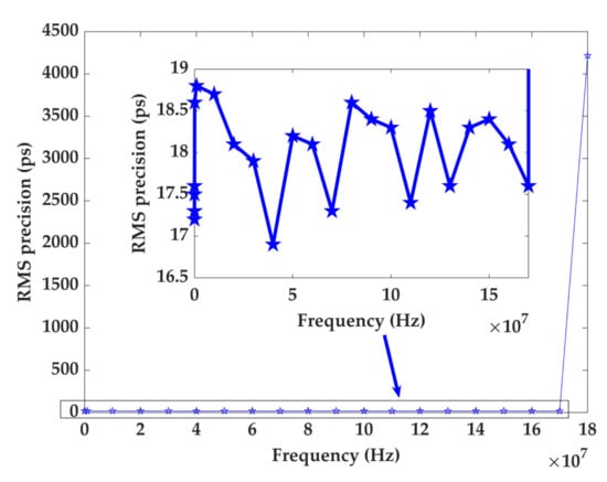 Dead time is also an important parameter influencing the sample rate. Different frequency signals entered into the TDC for testing the dead time. The precision is greatly reduced once the frequency is greater than 170 MHz as shown in Figure 14. The safest time interval is 5.882 ns, meaning the dead time is less than 3 clock cycles. More than one clock cycle is utilized to propagate the signal along the delay line, and then another clock cycle is used to sample the fine count by the D flip-flops.
