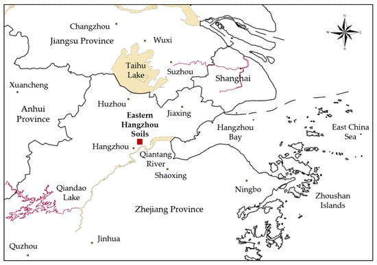 The soil sampled for this study came from a foundation pit in eastern Hangzhou, China as shown in Figure 2. The particle composition of soil determined by sieve analysis is summarized in Table 1. Silt contains 89.52% silt particles. Silty sand has a coarser particle size and contains 66.68% fine sand. Mucky silty clay is primarily composed of silt particles (67.76%), but also contains a significant amount of clay particles (30.08%).