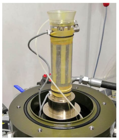 The saturated soil sample was covered with rubber film and slowly placed on the pressure chamber base with the bender element receiving device installed. At that time, the bender-element launcher was installed on the top of the sample cap. When installing the device, the upper and lower ceramic wafers should be parallel or the electrical signal cannot be captured. The installed sample is shown in Figure 3.